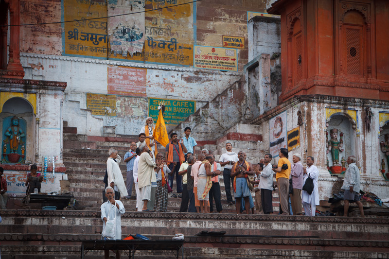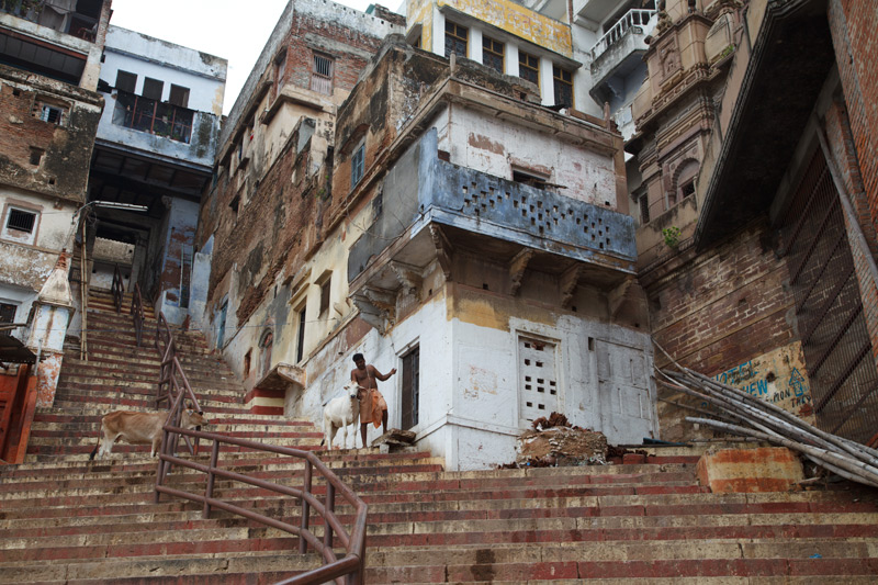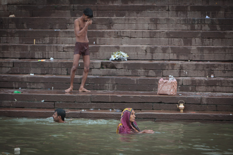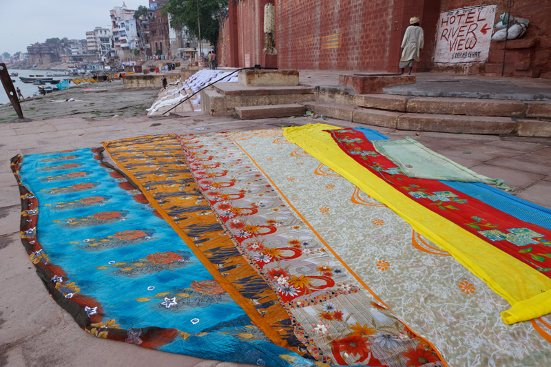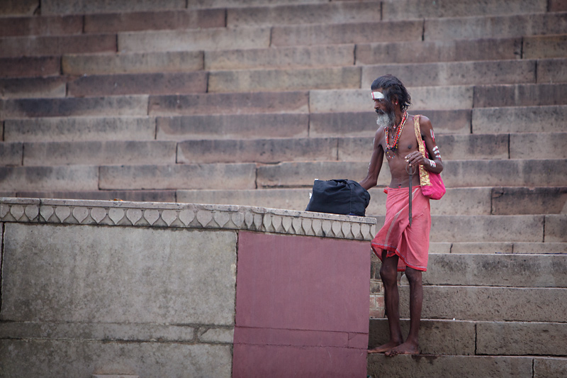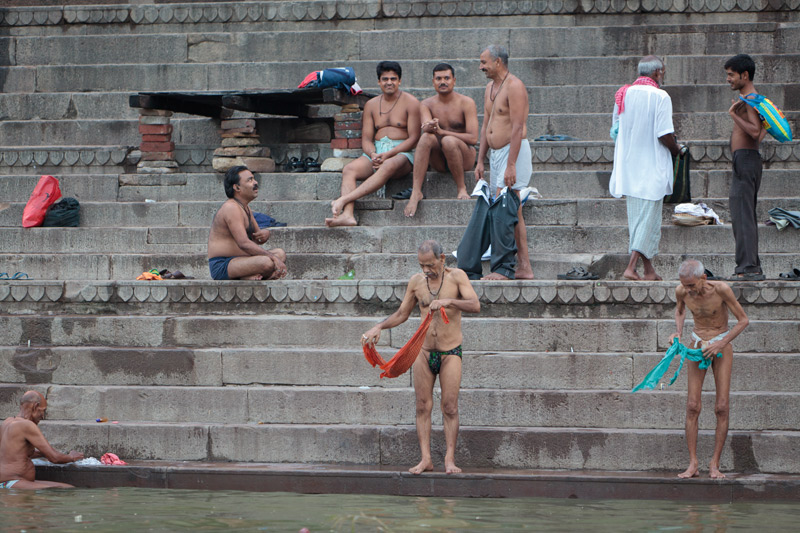 Po skończonym rejsie postanowiliśmy pospacerować po Ghatach. Z dwóch kierunków wybraliśmy ten, gdzie nie widać było żadnego turysty. Ogólnie mało ludzi napotkaliśmy, co jak na Indie jest dość dużym wyczynem. Miejscowa ludność zajęta była wykorzystaniem ekonomicznym rzeki - praniem. Zanieczyszcenie Gangi przekracze niewyobrażalnie wszelkie normy zanieczyszczenia, ale jeżeli kąpie się bydło, robi się pranie i myje się w wodzie, nie wspominając o wrzucaniu zwłok to trudno oczekiwać, żeby woda spełniała podstawowe kryteria czystości. Tutaj europejczyka nie obowiązuje powiedzenie "co cię nie zabije, to cię wzmocni".