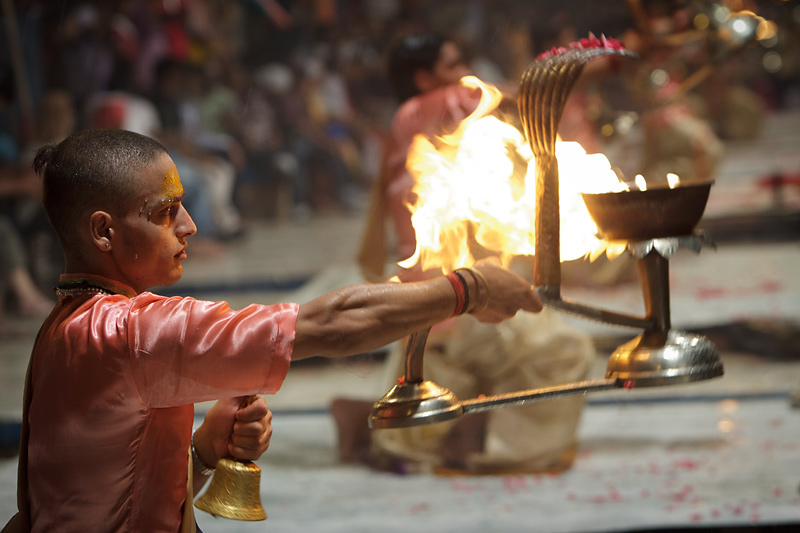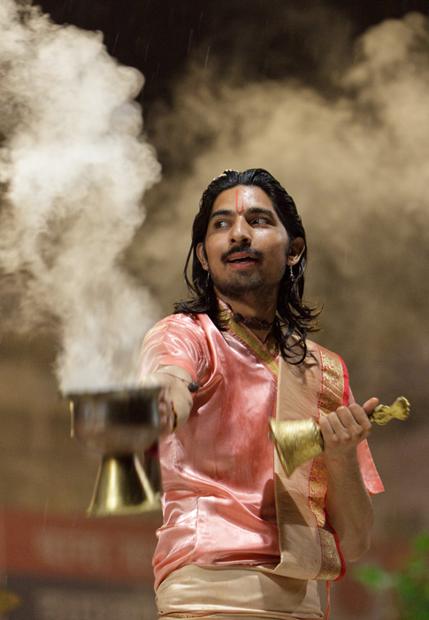 W Varanasi odżylismy. Wieczór spędziliśmy obserwujac nocny pokaz puja na głównej Ghacie. Ghaty (schody do rzeki) są największą atrakcją turystyczną. To tutaj nad brzegiem Gangi można obserwować wszelkiego rodzaju ceremonie religijne. Pożegnanie dnia, czyli wieczorną Puja można obserwować zarówno z wody jak i z lądu, a biorąc pod uwagę większą mobilność przy robieniu zdjęć, polecam drugą opcję. Deszcz przyjechał za nami z Agry, więc musieliśmy zainwestować w parasol. Ale warto było...