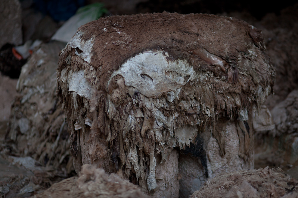 Z samego rana ruszyliśmy oglądać największą turystyczną atrakcje Fezu - farbiarnie. Dobrze maszerowało się o 8 rano, bo kramiki jeszcze nie otworzone, turystów nie ma i słoneczko też nie weszło na maksymalne obroty. Doprowadził nas napotkany Marokańczyk, który oszczędził nam sporo czasu w znalezieniu interesującego nas miejsca. Pracę farbiarni najlepiej jest obserwować z balkonów sklepów z galanterią skórzaną. Płaci się 10 DRH za wejście, no chyba że ktoś kupi coś z asortymentu, wtedy opłata nie jest już pobierana. Ze względu na zapach oprawianych skór, rozdaje się turystom mięte, którą mogą łagodzić niezbyt miłą dla nozdrzy woń. My nic nie potrzebowaliśmy, może z powodu wczesnej pory i małej intensywności smrodu, a może tak zadziałała na nas cofka z odprowadzenia wody, która wypełniła z rana nasz pokój w riadzie.
